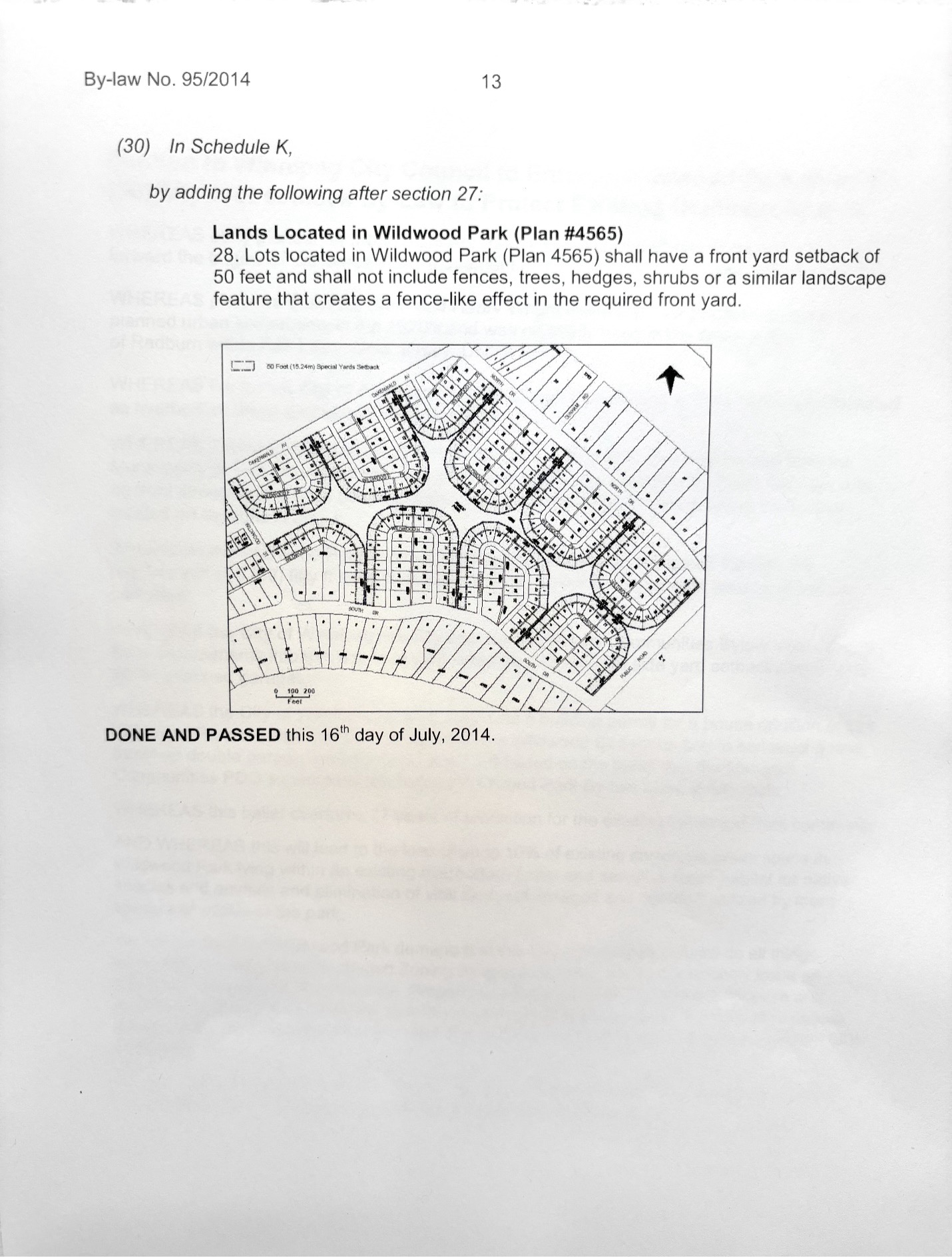 Wildwood Park’s name reflects its creator, Hugo Bird’s vision of a neighbourhood within a park, a green space of lawn, trees and forest from Point Road to SJR from front door to front door.That’s why there are no front streets, only common sidewalks.That’s why there are no front yard fences. That’s why there is 50’ front yard setback.That’s why By-Law No. 95/2014 (See below) was passed to protect Wildwood’s park setting enshrining the 50’ setback and no front yard fences.
